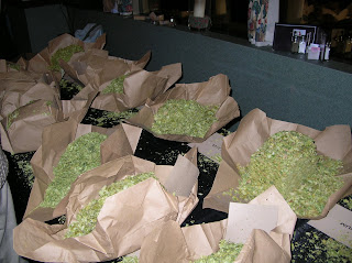 After running through a slideshow presentation, us invitees were ushered to the corner of the room to rub each of the 10 varieties of hops (leaves) laid out on a table. There was Mt. Hood, Chinook, Cascade, Magnum, Cluster, Galena, Tettnanger, Golding (US), Willamette, and Sorachi Ace. Greenish-yellow-sticky hands followed and a trip to the washroom was in order. I don't know why Major League Baseball doesn't adopt hop for grip. I mean, rub some together in your hands and grip it and rip it.