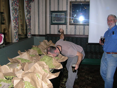 The information session commenced shortly after the 6pm projected start time with approximately 45 individuals representing many of the small breweries in the province. Amsterdam, Great Lakes, Cameron's, Black Oak, Pepperwood Bistro & Brew pub, Olde Stone Brew pub, Cool, Trafalgar, Heritage, Lakes of Muskoka, Granite, Durham, F&M, Nickel Brook, Denison's, Saint Andre, Grand River, Hockley Valley, and King all sent representatives to the event and all were in a good festive mood, catching up with one another and discussing their trade. Latimer introduced the wife of Stacy Puterbaugh, operator and third generation owner of Hops Direct (I cannot remember her name - sorry) and spoke a little about their farm, how they operate and provided a current update on the global hop situation. Latimer also spoke about his relationship with Hops Direct and mentioned that his first ever order was around $6000 and his latest was $76,000. Wow.